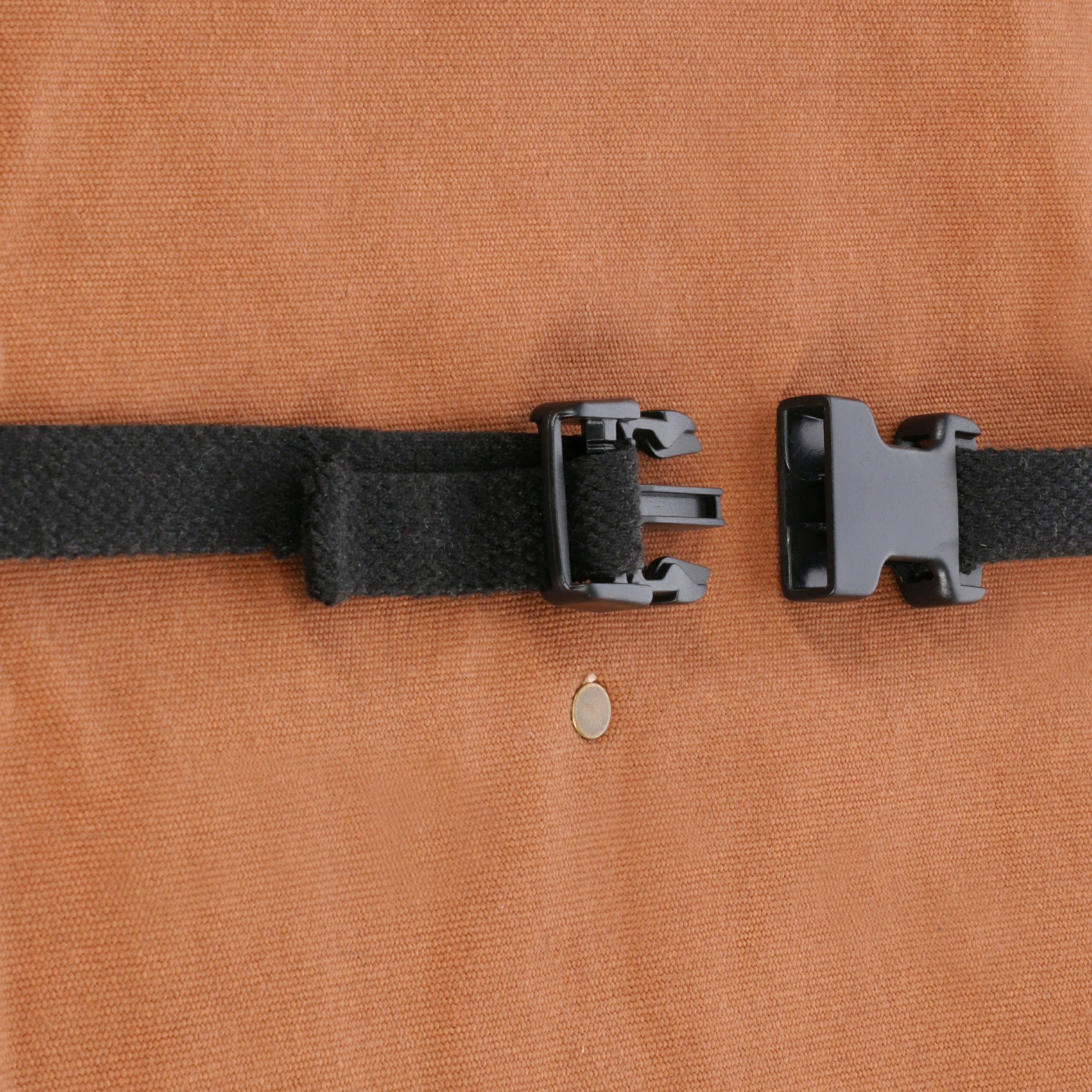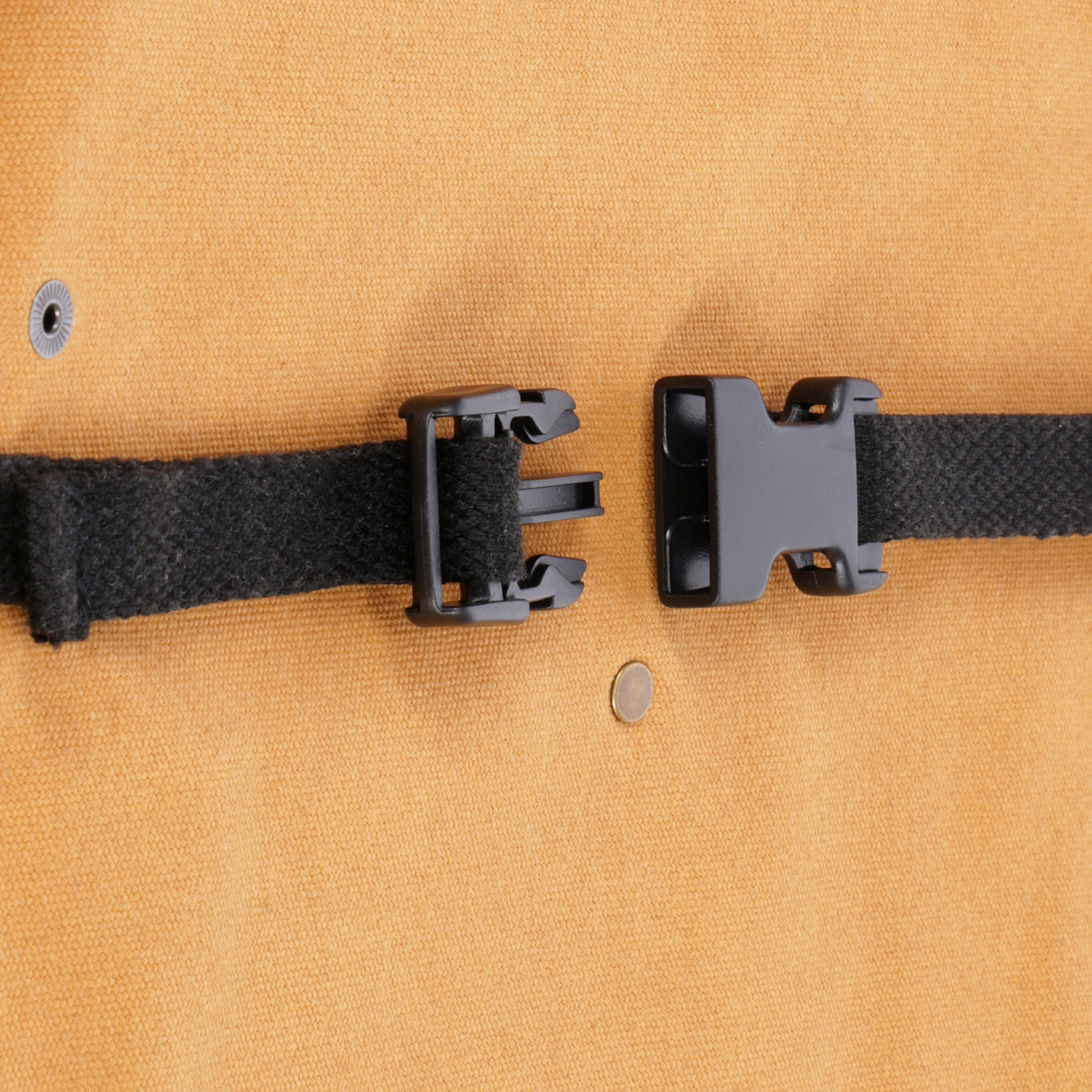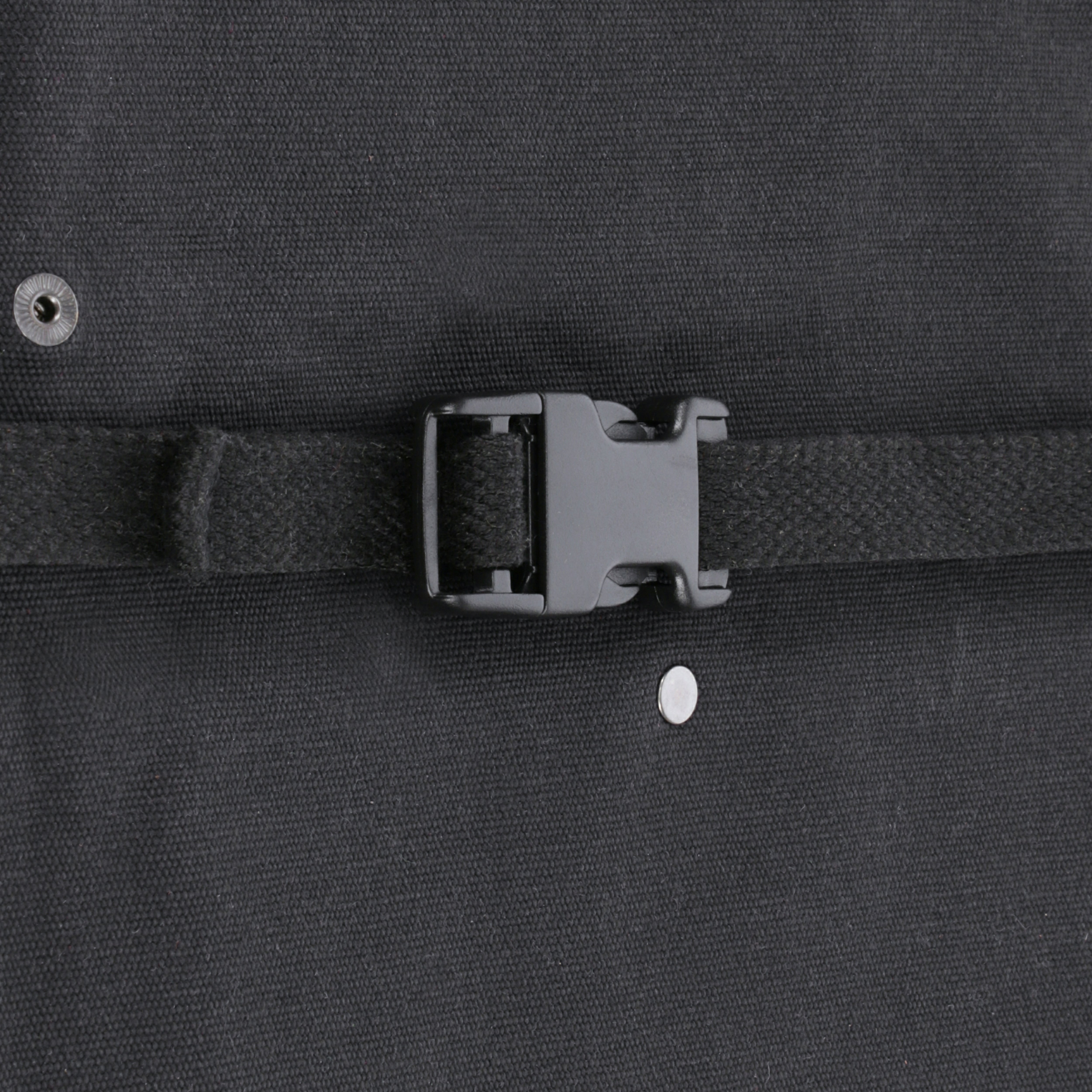 - Trims Metal grommets and rivets, leather loops, plastic buckle, cotton webbing