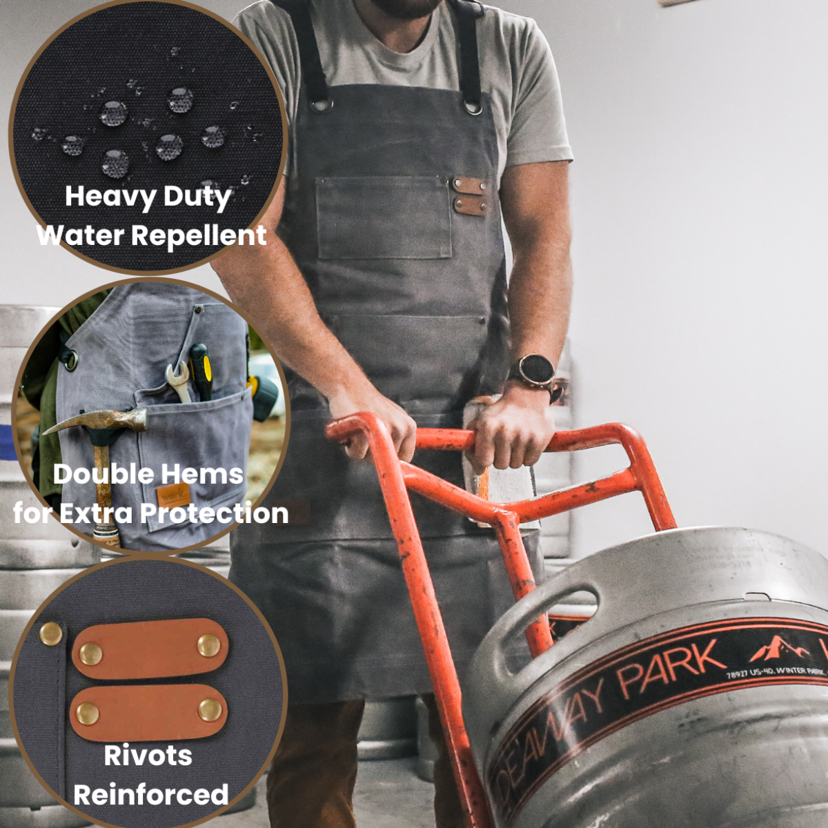 - There are dual leather loops on both sides and at the top front to carry hammer, wine key, bottle opener etc.